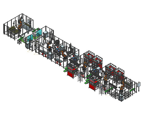 圓柱電池模組PACK自動組裝線由上料分選機、入下支架機、電芯極性檢測、裝上支架機、鎳片裝載機、鎳片焊接機、焊點檢測、貼膠紙機、保護板裝載焊接機,半成品檢測機、外殼裝載機、EOL測試機、貼標(biāo)機及靈活人工位組成。