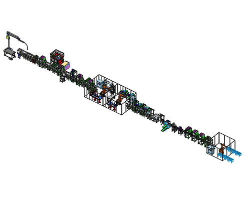實(shí)現(xiàn)電芯上料,極耳裁切,整形,電壓內(nèi)阻測(cè)試,等離子清洗,電芯貼泡棉和電芯翻轉(zhuǎn)等功能模組焊接入殼組裝段實(shí)現(xiàn)極柱激光清洗,上巴片,激光焊接巴片,安裝采集線(xiàn)及測(cè)溫頭等功能。