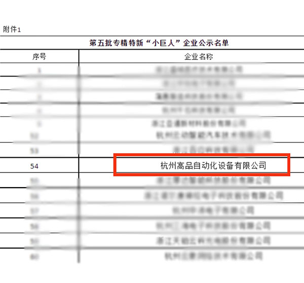 根據工信部統(tǒng)一部署,7月14日,浙江省經信廳發(fā)布了《關于浙江省第五批專精特新“小巨人”企業(yè)和第二批專精特新“小巨人”復核通過企業(yè)名單的公示》。根據公示,全省共有384家企業(yè)新入圍第五批專精特新“小巨人”企業(yè)名單,其中杭州企業(yè)117家,位居全省第一。杭州高品自動化設備有限公司榜上有名!