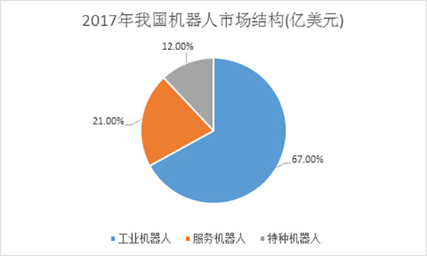 2017年我國機器人市場規(guī)模達到62.8億美元,2012-2017年的平均增長率達到28%。其中,工業(yè)機器人42.2億美元,服務(wù)機器人13.2億美元,特種機器人7.4億美元。