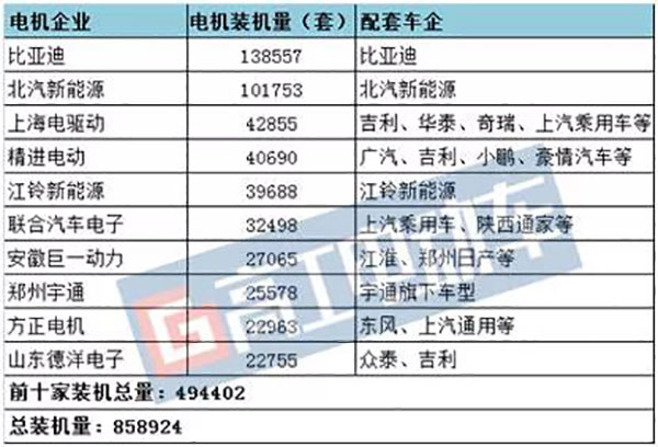 根據(jù)數(shù)據(jù)顯示,2017年電機裝機量排行前十名的企業(yè)有比亞迪、北汽新能源、上海電驅(qū)動、精進(jìn)電動、江鈴新能源等企業(yè),占據(jù)總裝機量的57.56%。其中,整車企業(yè)有4家,裝機數(shù)量占比超過6成。具體數(shù)據(jù)如下: